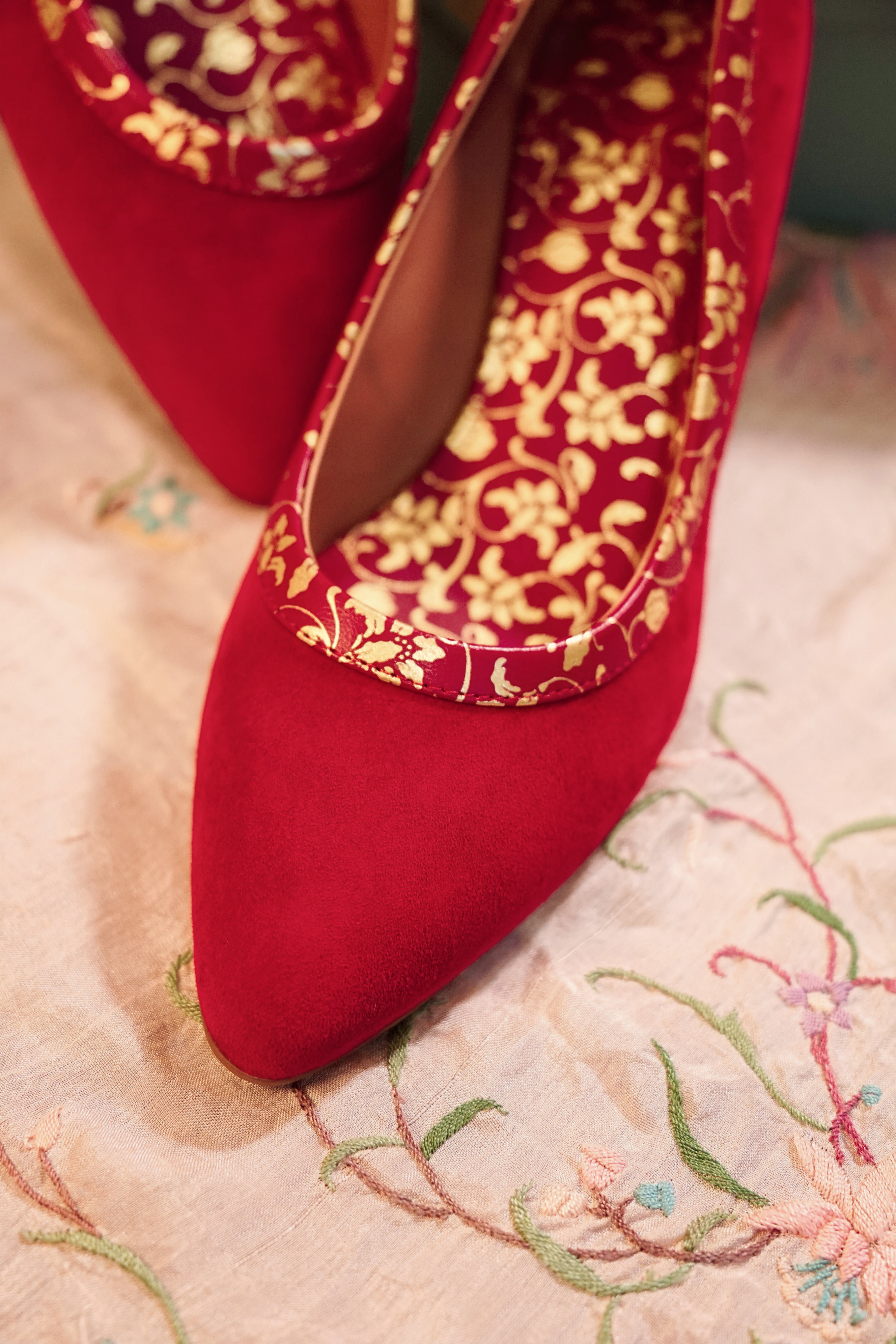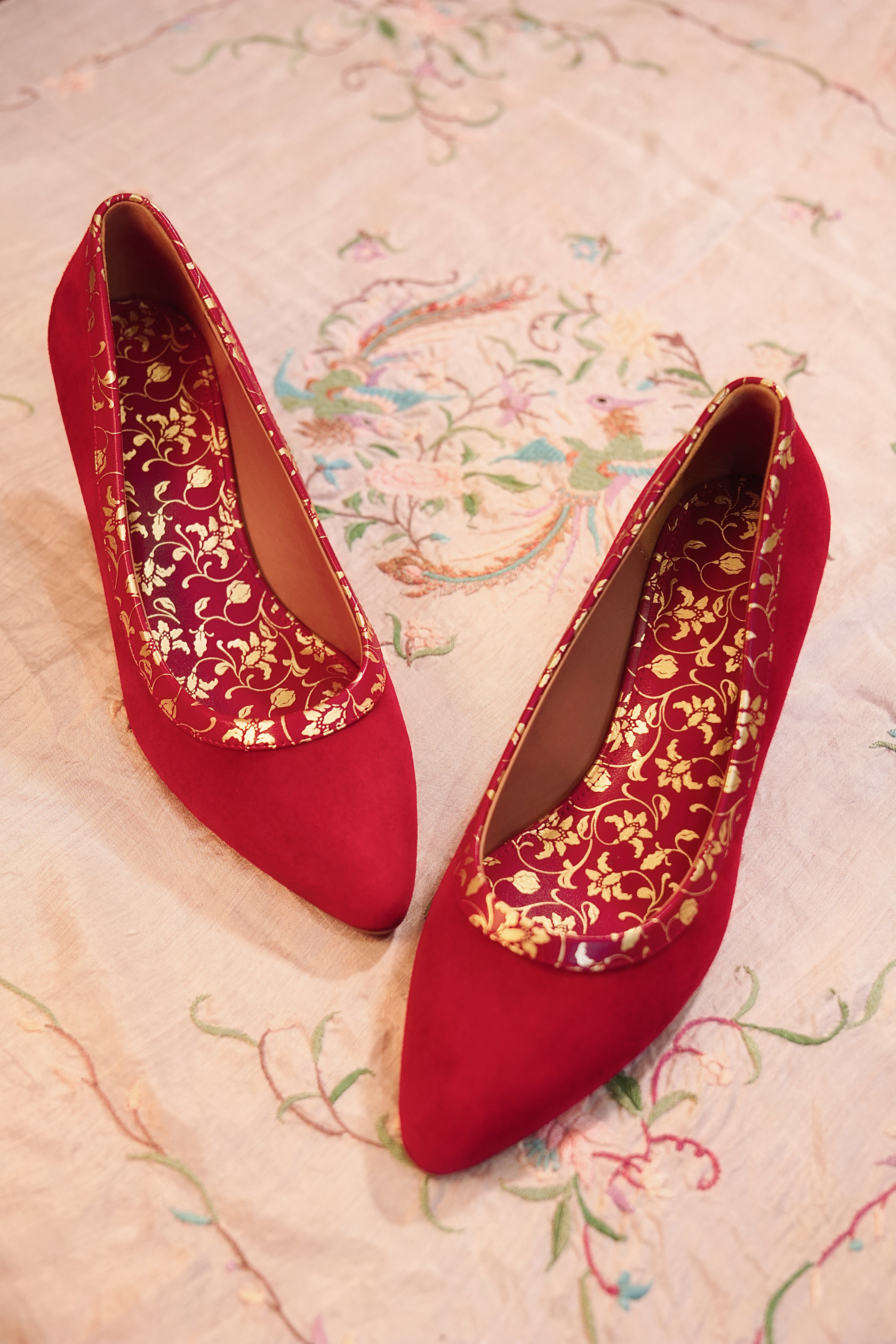 朱红金紫荆纹尖头高跟鞋