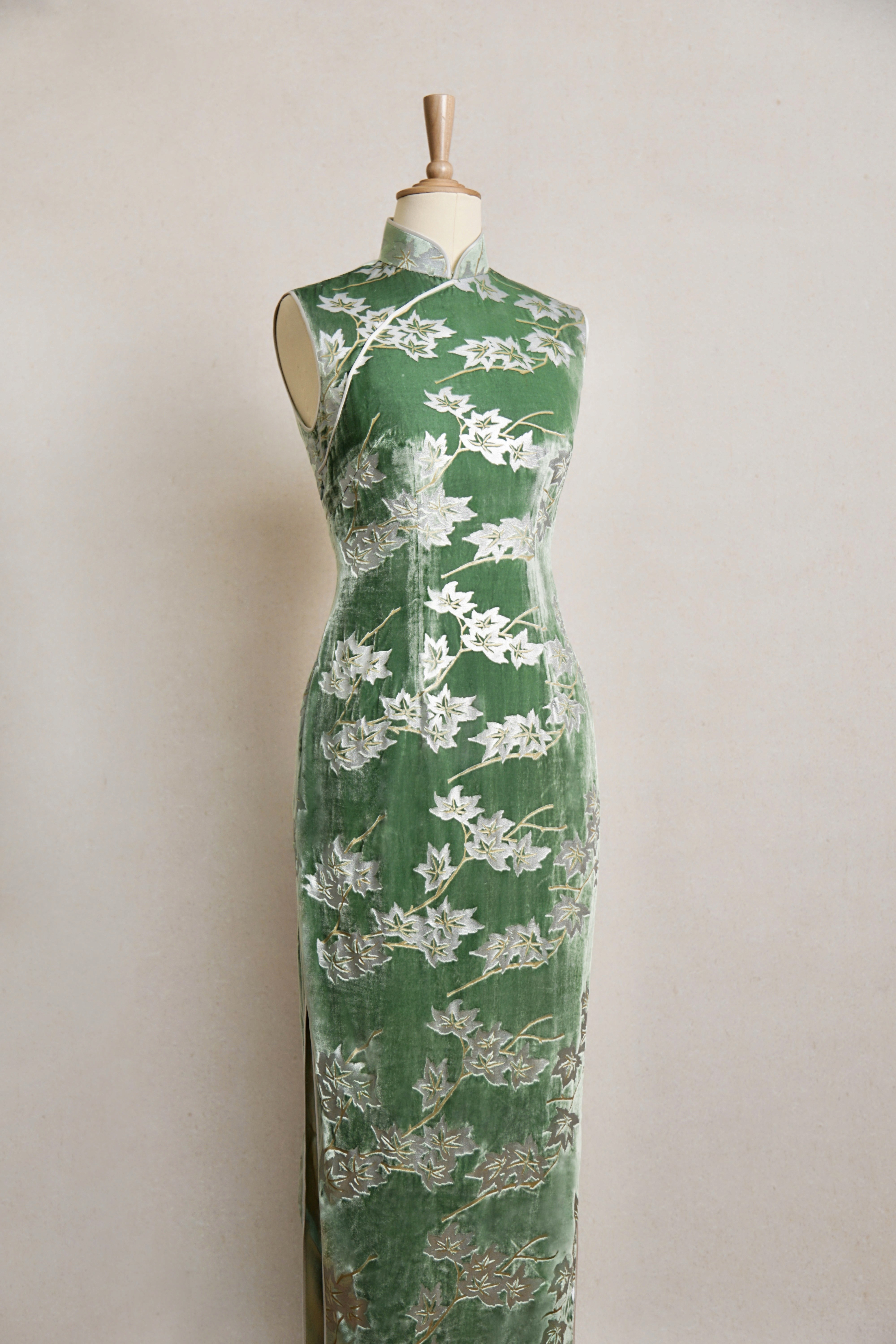 青瓷绿枫叶丝绒旗袍