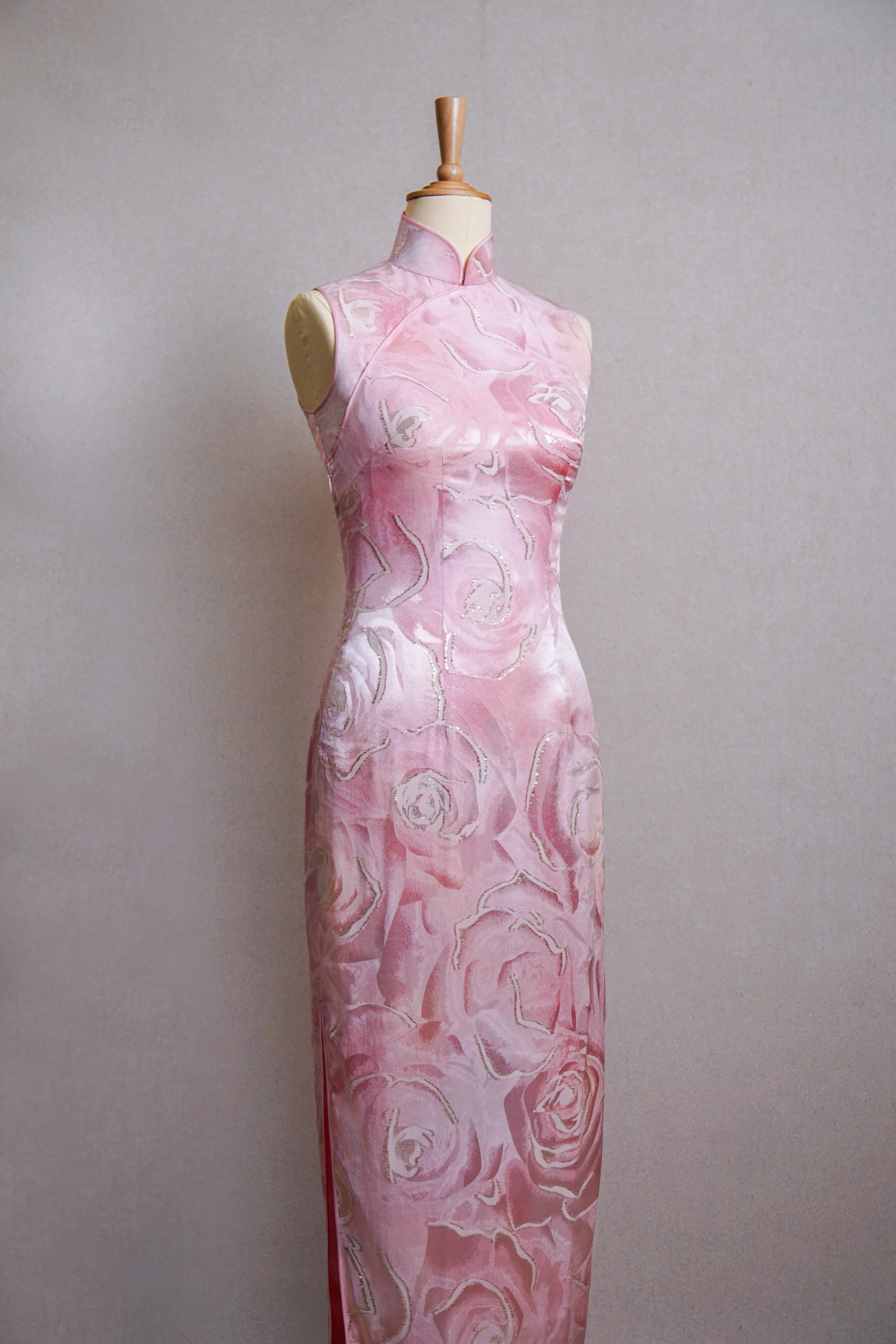 织银边粉玫瑰花旗袍