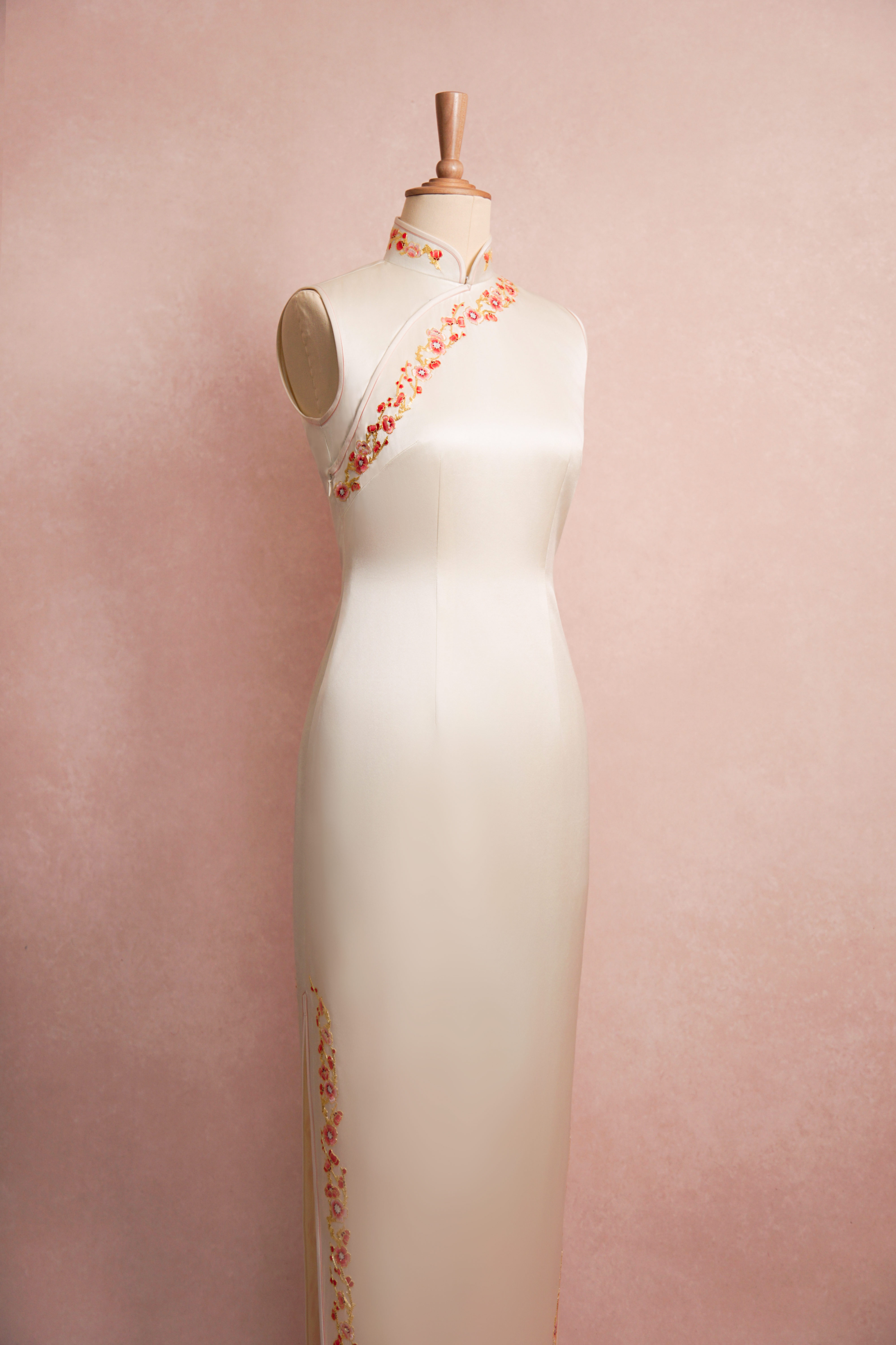 香槟缎面盘金绣粉梅旗袍