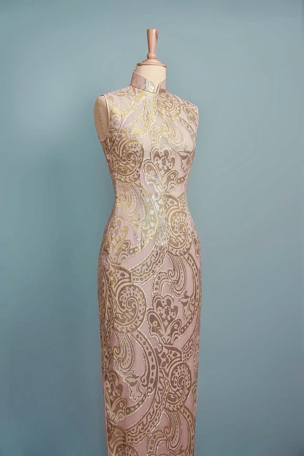 皮粉金银佩斯利纹旗袍