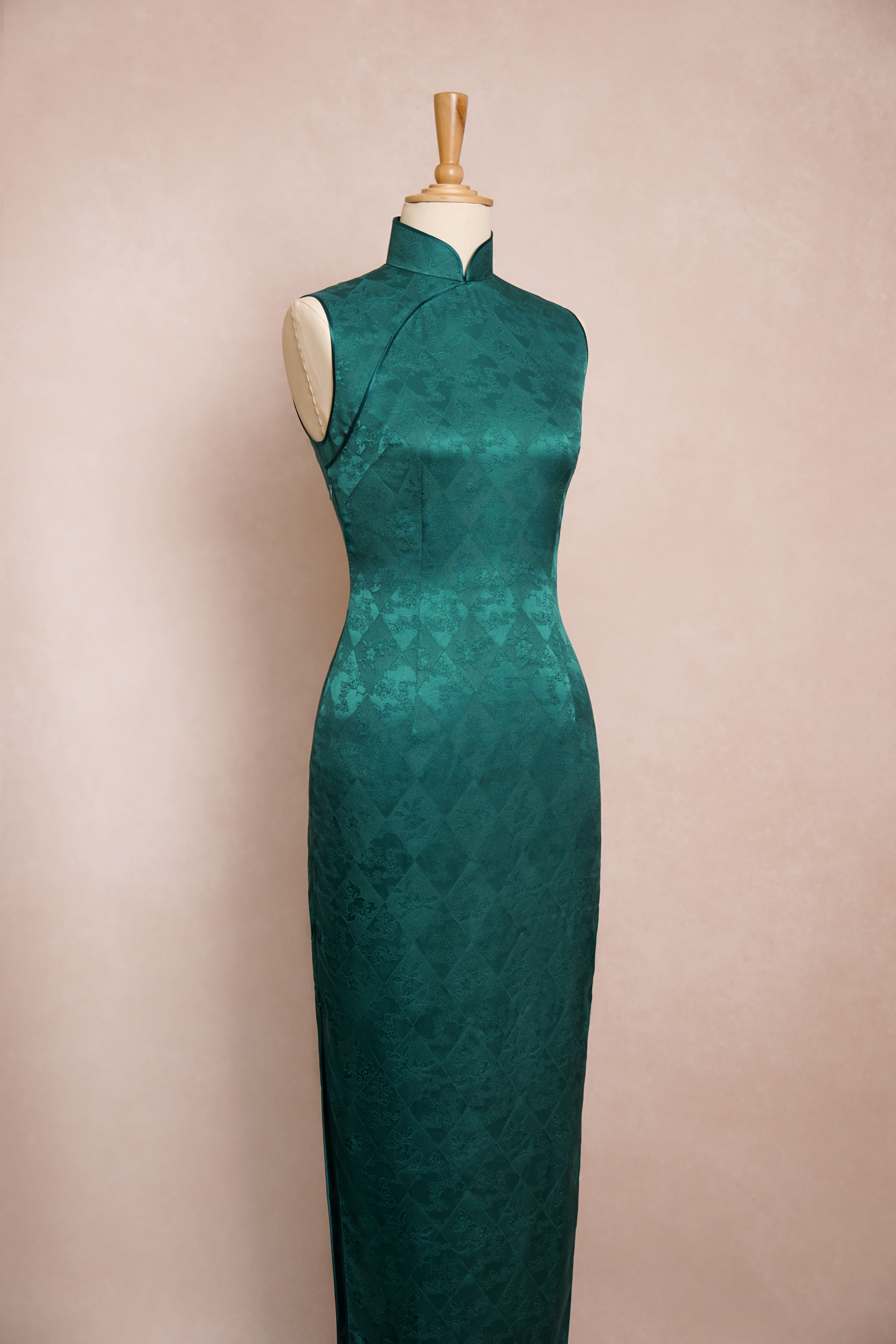 碧青菱格纹旗袍