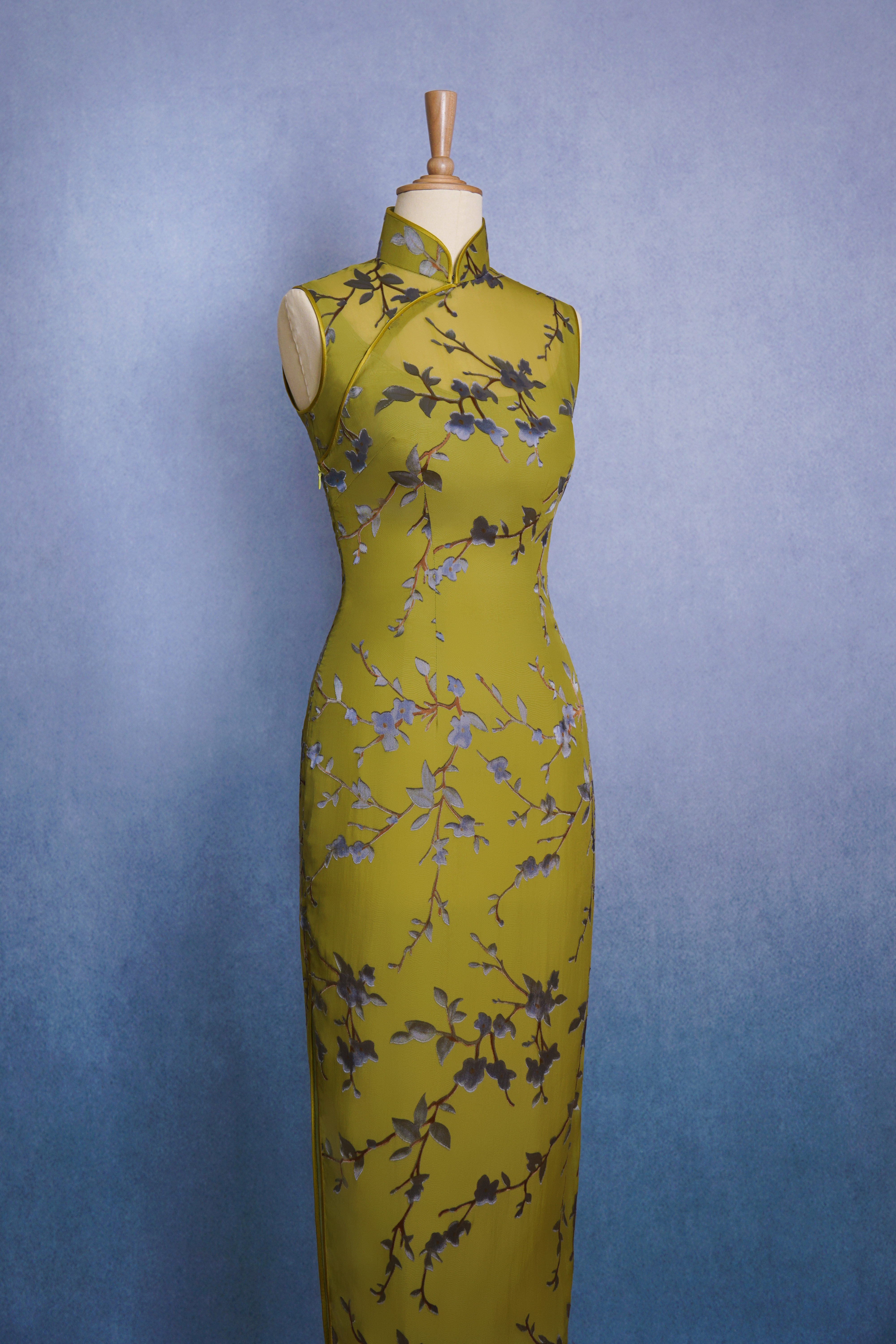 芥末绿银梅花枝旗袍