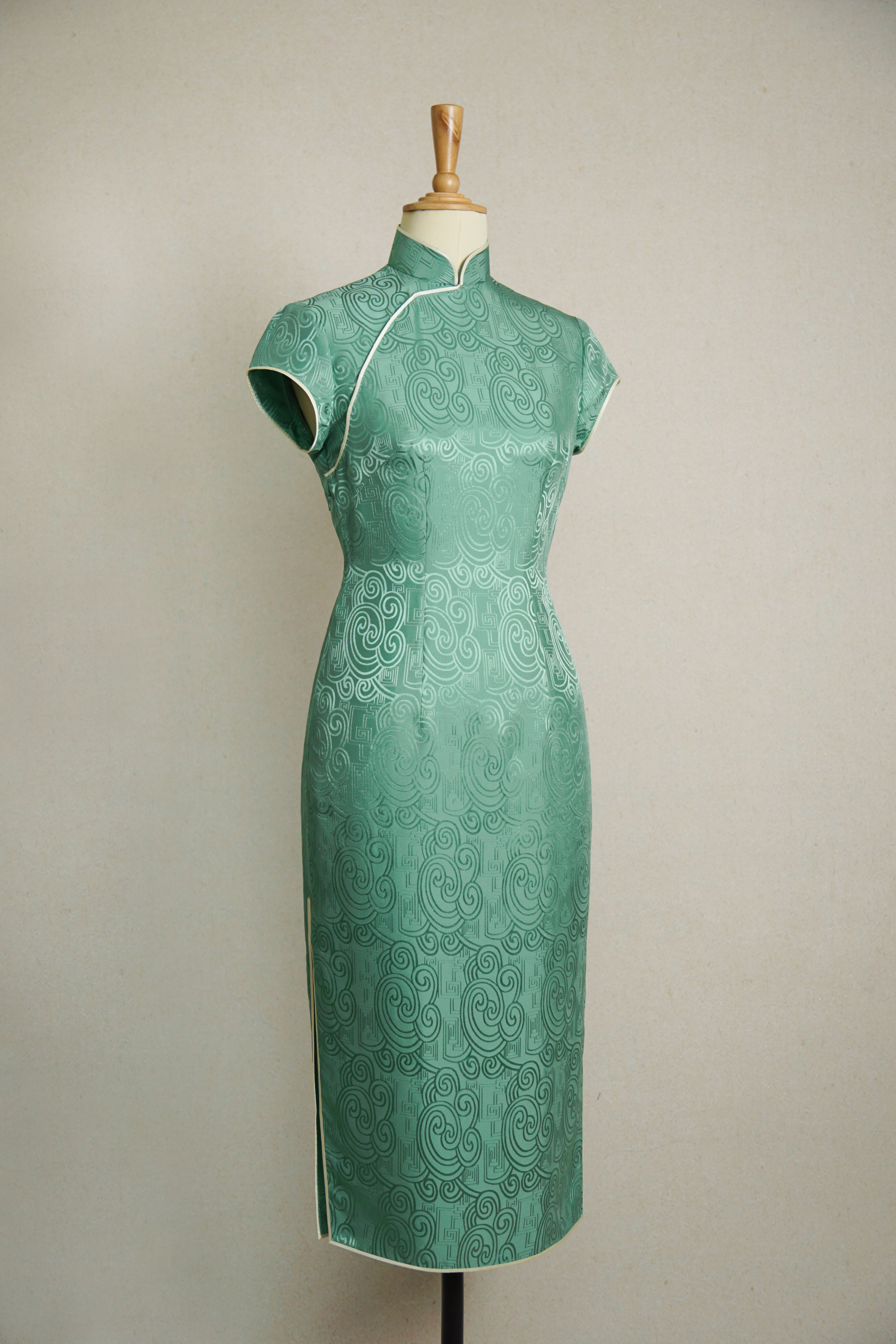 香江绿几何云雷纹旗袍