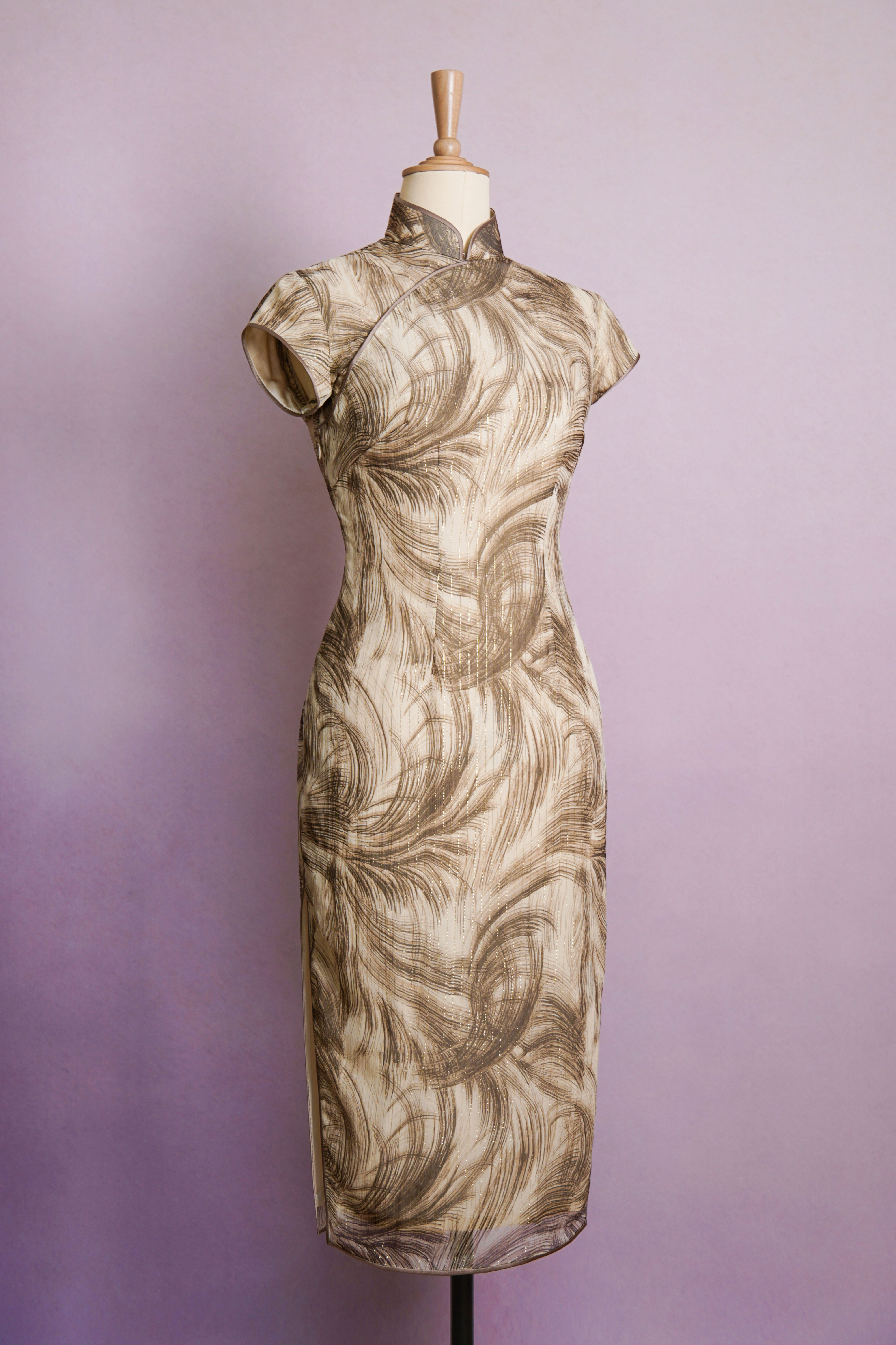 金咖棕榈羽毛纹旗袍