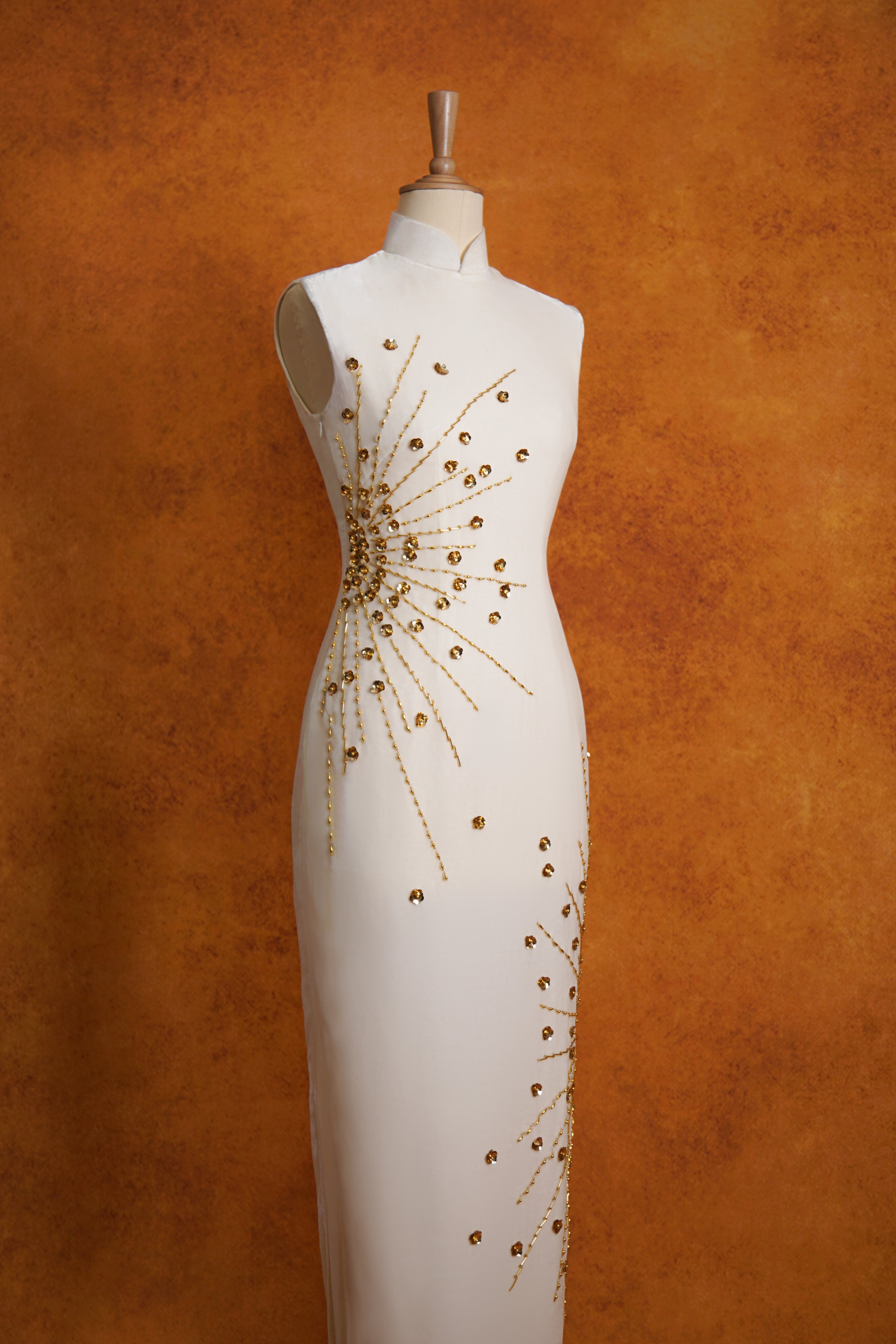 白丝绒亮金烟花钉珠旗袍