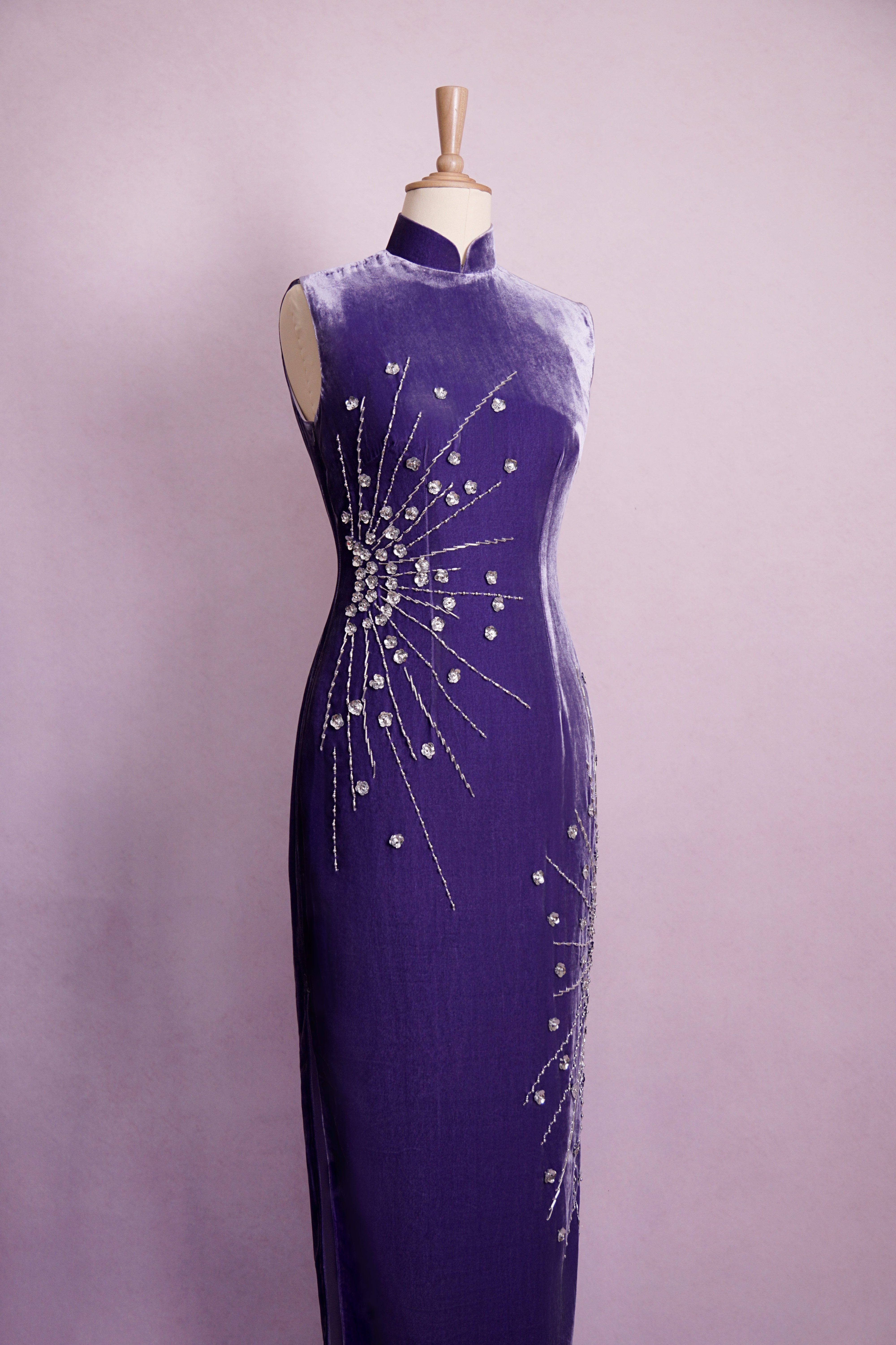 紫丝绒亮银烟花钉珠旗袍